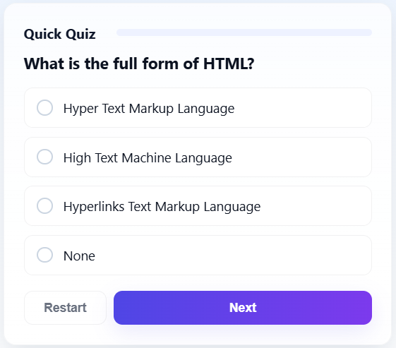 An interactive quiz application with multiple-choice questions and scoring system.