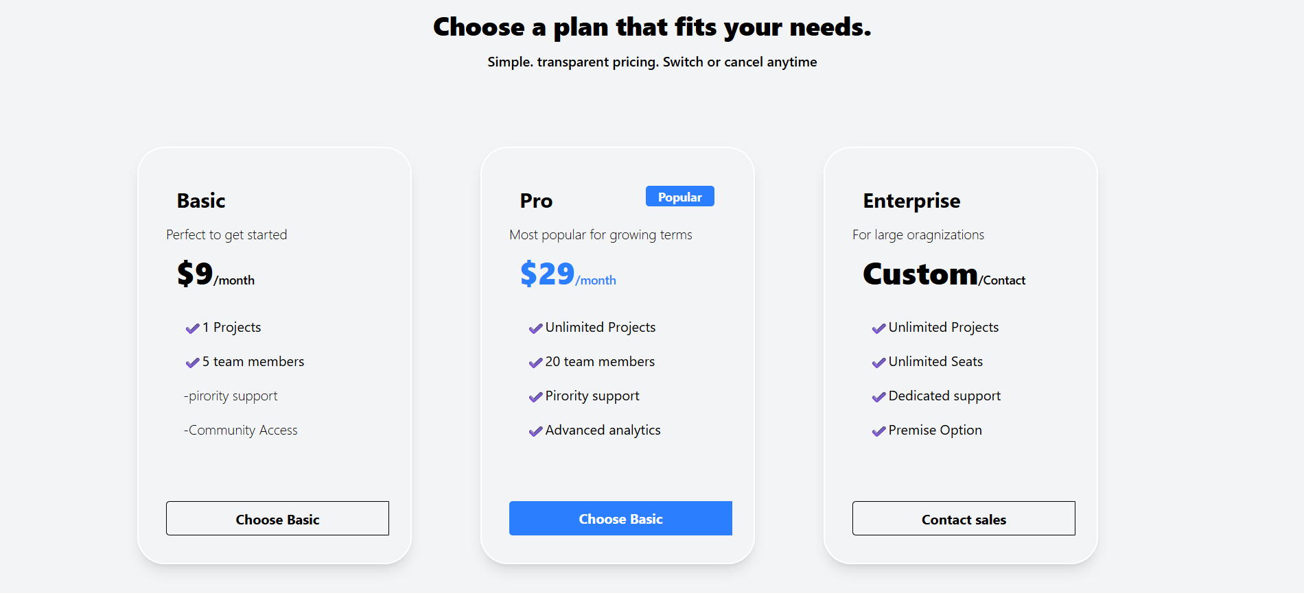 A responsive subscription plan page with interactive pricing cards and toggle options.